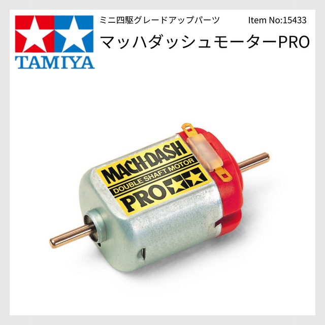 ブランド:TAMIYA Item No:15433 3月30日にまとまった入荷決まりました。順次発送致します。 【商品内容】 マッハダッシュモーターPRO 15433 MACH-DASH MOTOR PRO 【 ミニ四駆PRO用の高回転型ハイパワーモーター 】 ミニ四駆PRO専用のダブルシャフトモーターです。銀カーボンブラシを採用した高回転型のハイパワーが魅力。特に高速サーキットで威力を発揮します。小径タイヤの使用がおすすめ。ゴールドのラベルに赤いエンドベルが目印。ピニオンギヤは別売りです。 【 基本スペック 】 適正電圧:2.4~3.0V 推奨負荷トルク:1.3~1.8mN・m 回転数:20000~24500r/min 消費電流:2.6~3.5A ※推奨負荷トルク時 【 使用可能マシン 】 ミニ四駆PRO各車