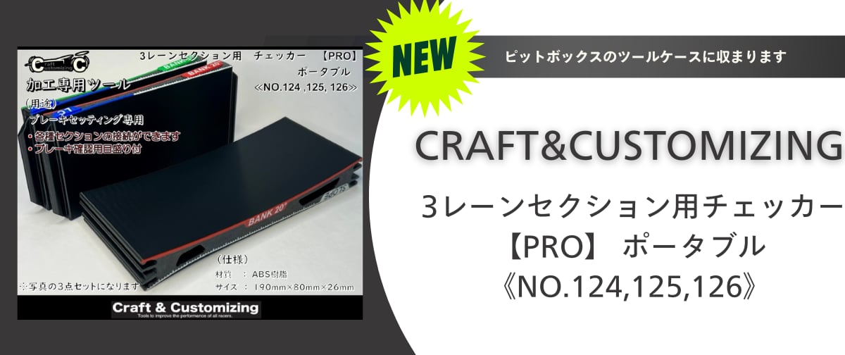 ブランド:Craft&Customizing 品番:NO.124,125,126 3レーンセクション用チェッカー【PRO】 ポータブル 【商品紹介】 3レーンコースのセクションを模擬したチェッカーになります。 ・チェッカーPROの機能はそのままに、ピットボックスに収納できるようにサイズを小さくして、持ち運び性を向上させたツールになります。 ・ピットボックスのツールケースに収まります。 ・マシン収納棚と差し替えることで、収納スペースを活用いただけます。 ・チェッカーPROではなかった、中部品のオプション品を通常付属予定。 →基本仕様は、ストレート・レーンチェンジ(LC)、30度バンク、20度バンク ・現地のコースにあわせて、チェッカーをカスタマイズして最適な準備ができるようになります。 《3レーンセクション用チェッカー 3種類セット》 ・セクションおよびストレートを組み合わせてブレーキセッティングが行なえます。 ・ストレートとバンクセクションを組み合わせることができ、ストレートからのバンク状態を確認できます。 ・できる限り再現を高めた仕様になっておりますが、100%確実でないことをご了承ください。 <対応セクション> ・20°バンク ・30°バンク ・レーンチェンジ(LC) ・スロープ ・ストレート <内容物> 計3点 ・ストレート/LC/30°バンク 《NO.124》 ・ストレート/LC/20°バンク 《NO.126》 ・スロープ/20° 《NO.125》 <仕様> ・材質 ABS樹脂 ・サイズ 190mm × 80mm × 26mm