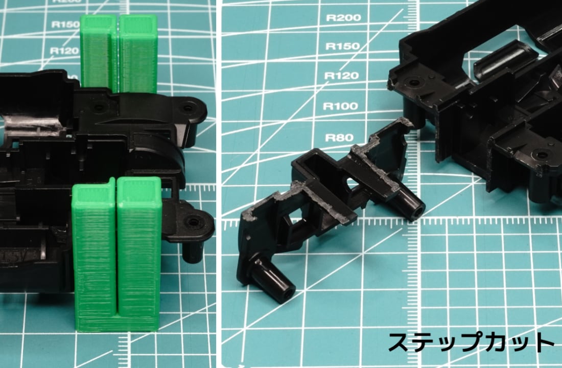ステップカット:フラットカットよりカットラインを約1mmユニット側にをズラし、フラットカットより少し稼働を制限します。