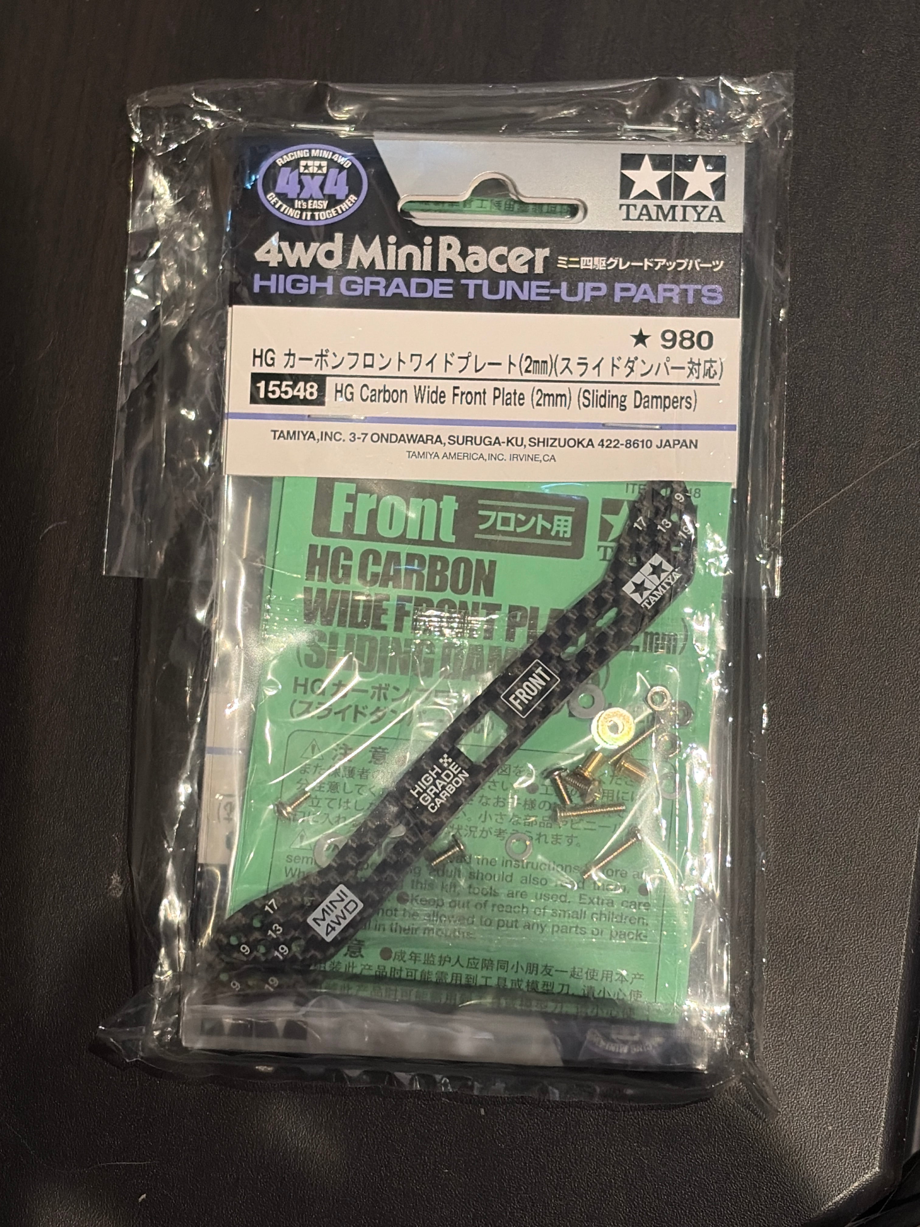 2mm厚カーボン製のフロントワイドプレートと取り付け用ビス・ナットなどをセット